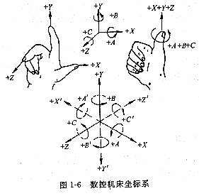 數(shù)控機床各軸的標示乃是根據(jù)右手定則。當右手拇指指向正X軸方向,食指指向正Y軸方向時,中指則指向正Z軸方向。圖1-7所示為立式